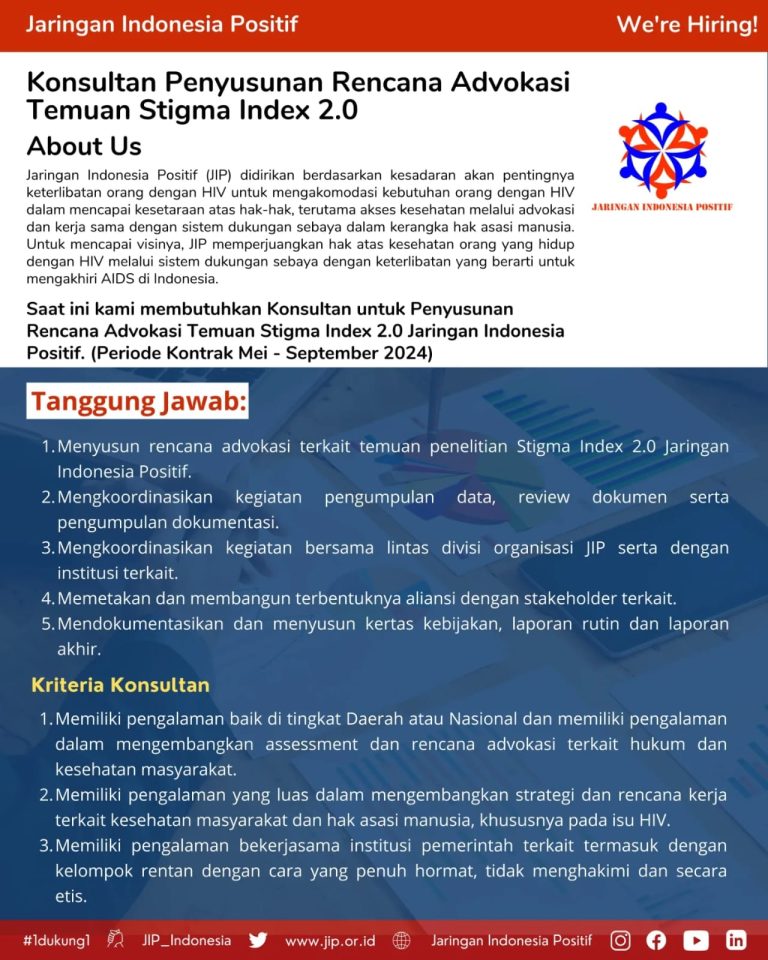 Kami berharap hasil dari studi Indeks Stigma 2.0 di Indonesia akan mempengaruhi kebijakan dan program nasional serta meningkatkan kehidupan orang-orang dengan HIV. Menciptakan lingkungan bebas stigma sangat penting untuk mencapai target “95-95-95” Indonesia dan mengakhiri AIDS pada tahun 2030. Mengakui bahwa stigma dan diskriminasi merupakan hambatan dalam layanan tes dan pengobatan HIV, pada tahun 2021, PBB meluncurkan kampanye “Zero Stigma” dengan kerangka kerja global 10-10-10 yang baru: Kurang dari 10% negara memiliki lingkungan hukum dan kebijakan yang represif yang menghalangi akses keadilan, kurang dari 10% orang dengan HIV dan populasi kunci mengalami stigma dan diskriminasi, serta kurang dari 10% wanita, anak perempuan, orang dengan HIV, dan populasi kunci mengalami ketidaksetaraan gender dan kekerasan.