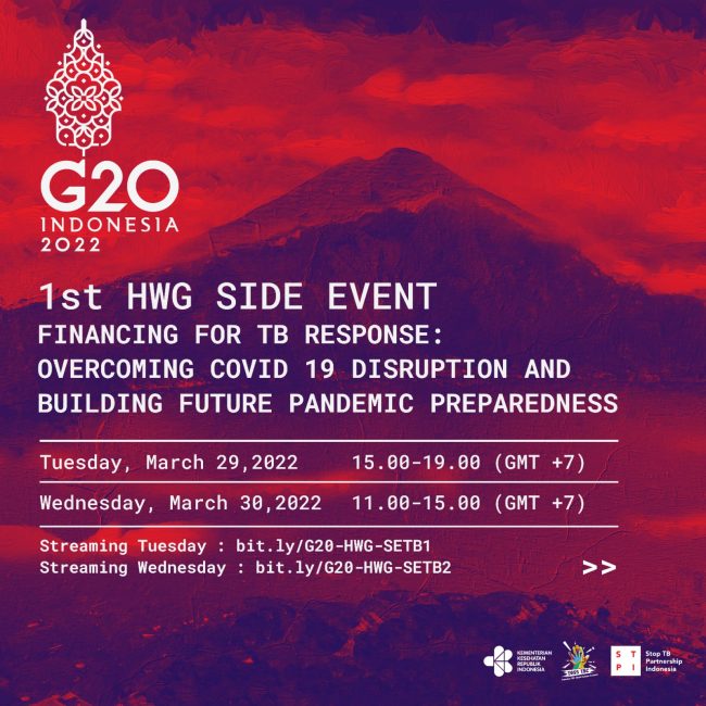 Join the G20 1st Health Working Group Side Event on Tuberculosis (T): Financing for TB Response: Overcoming Covid 19 Disruption and Building Future Pandemic Preparedness.